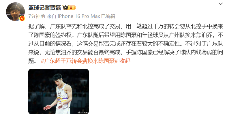 还有的媒体人报道,广东队的确是付出了超过千万的转会费从北控队手里得到陈国豪,但后续希望能用他和年轻球员从广州队那里换来焦泊乔......