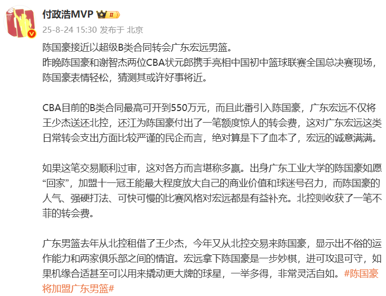 但另外的媒体人却表示,陈国豪是转会到广东队并接近超级B类合同签约,而广东队为了得到这位23年状元秀,不仅将王少杰交易回北控队,还提供了一笔额度惊人的转会费。