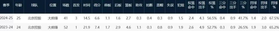 出生于1999年8月12日的陈国豪,刚满26岁不久,身高2米出头的大前锋,在北控队的两个赛季,菜鸟赛季场均出战21.9分钟,贡献7.4分4.6板1.2助,二年级即上赛季场均出战14.4分钟,得到6.6分2.7板,作为土生土长的广东人,终于新赛季就能为自己的家乡球队效力。