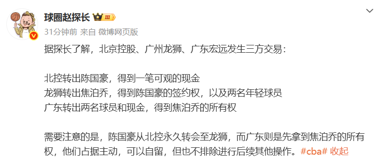 简单来说,三方交易是真的,陈国豪的确离开了北控队,目前唯一悬念在于他究竟效力广东队还是广州队?