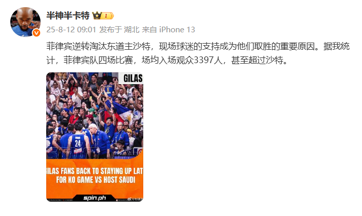 此前,媒体人张铎,他根据FIBA的官方数字统计了菲律宾男篮本届亚洲杯的四场比赛,场均入场观众达到3397人,甚至超过了东道主沙特队。