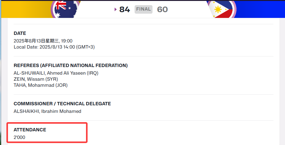 FIBA官方数据显示,菲律宾和澳大利亚的这场比赛,共有2000人进场观看。